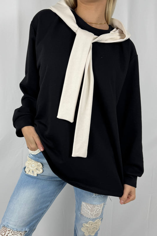 Oversize Pullover mit Schal-Detail-Schwarz