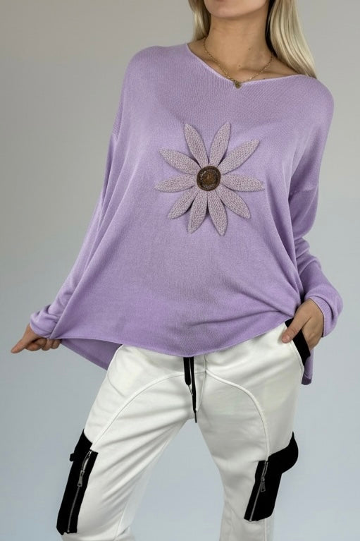 Shirt mit V-Ausschnitt & floraler Applikation-Lilla