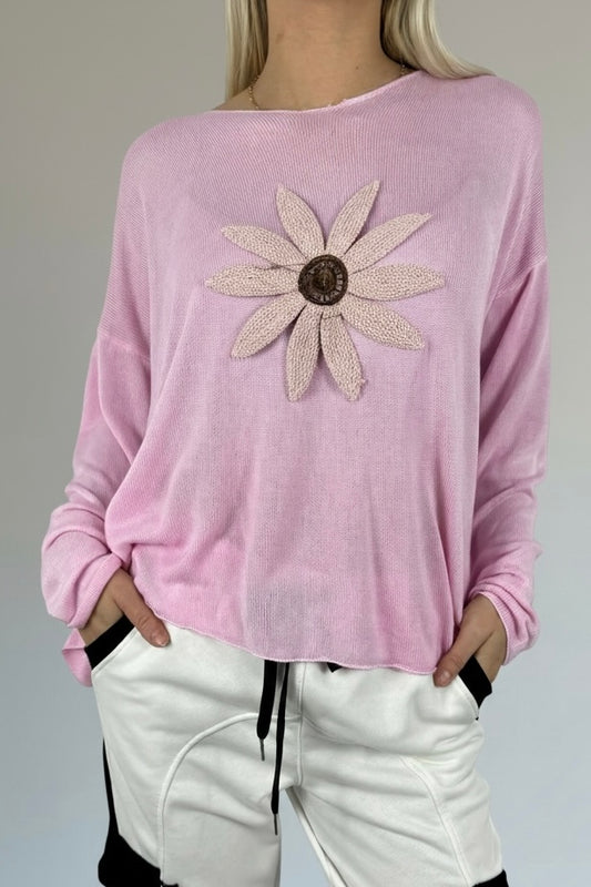 Shirt mit V-Ausschnitt & floraler Applikation-Rosa