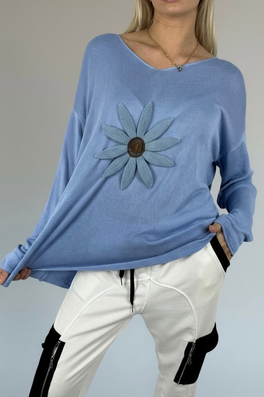 Shirt mit V-Ausschnitt & floraler Applikation-Blau