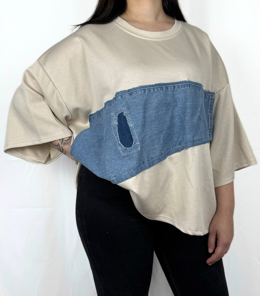 Beiges T-Shirt mit Jeansdetails – trendiger Materialmix