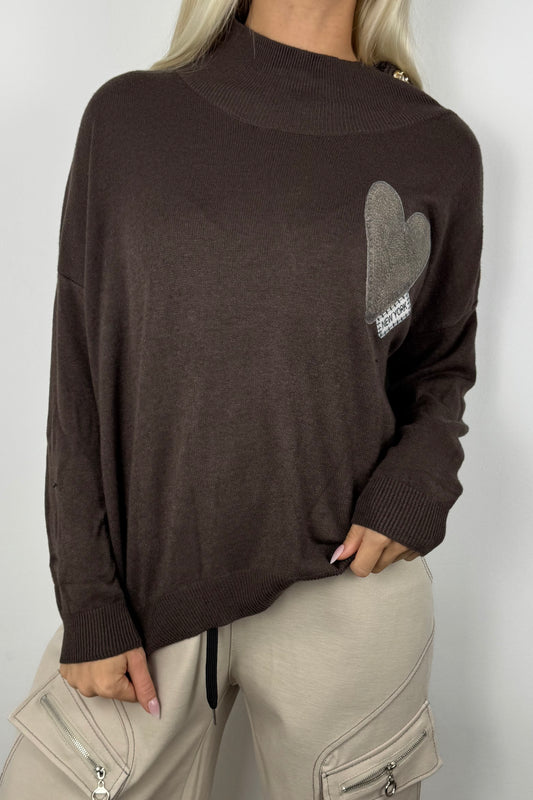 Oversize Shirt mit Herz-Patch & Zierknöpfen –Choco