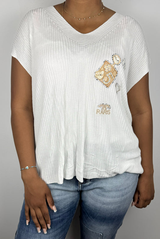 Rippstrick-Shirt mit Glitzerapplikationen und V-Ausschnitt