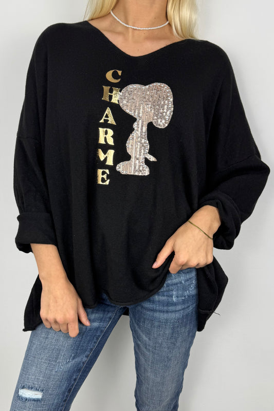Damen Shirt mit V-Ausschnitt und Glitzer-Applikation –Schwarz