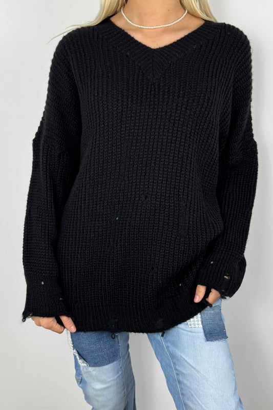 Oversize Strickpullover mit V-Ausschnitt – Schwarz