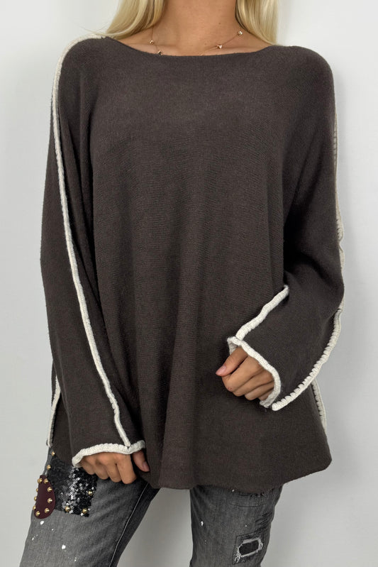 Locker geschnittenes Strickshirt mit Kontrastkante –Choco