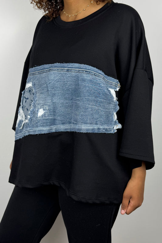 Schwarzes T-Shirt mit Jeansdetails – cooler Kontrast-Look
