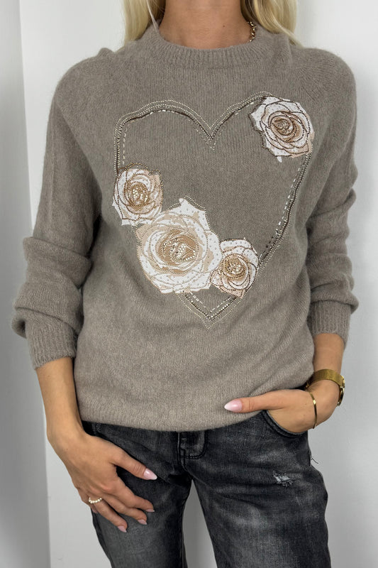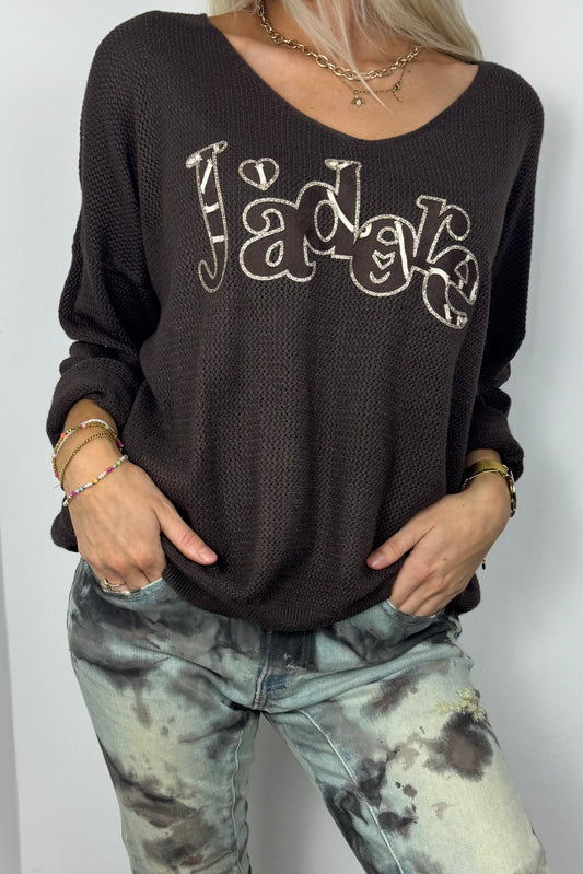 Lockerer Strickpullover mit „J’adore“-Schriftzug-Choco