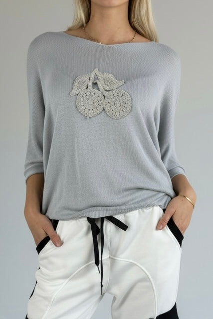 Shirt mit V-Ausschnitt & gehäkelter Applikation-Grau
