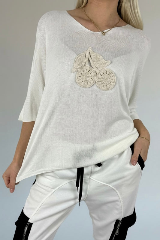 Shirt mit V-Ausschnitt & gehäkelter Applikation-Weiß