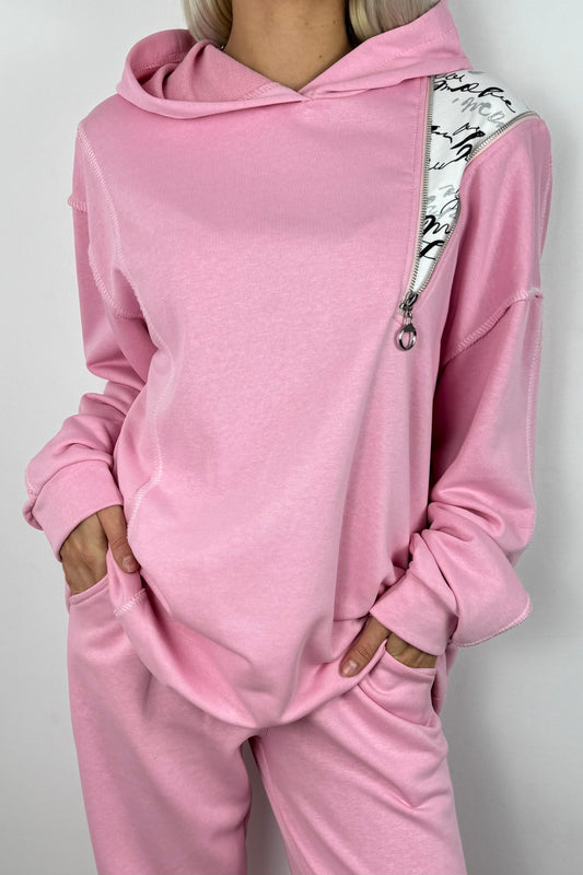 Asymmetrischer Hoodie mit Zipper –Rosa