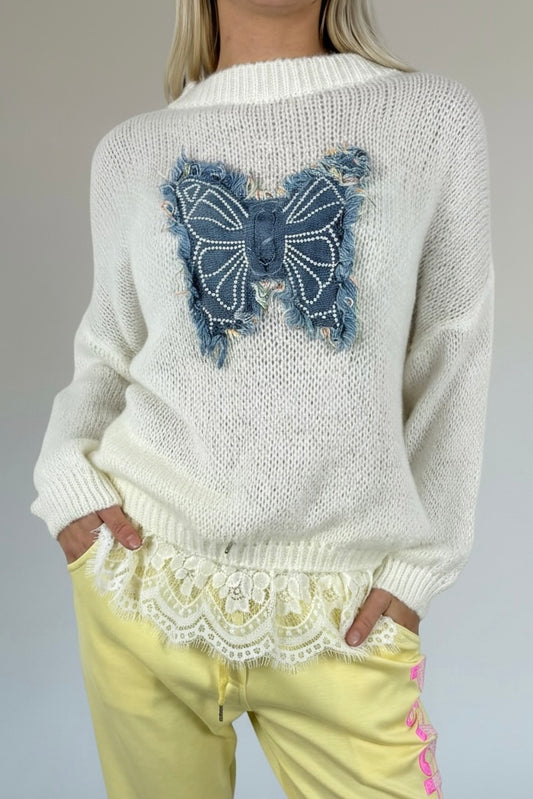 Strick Shirt mit Schmetterlings-Applikation & Spitzenabschluss-Weiß