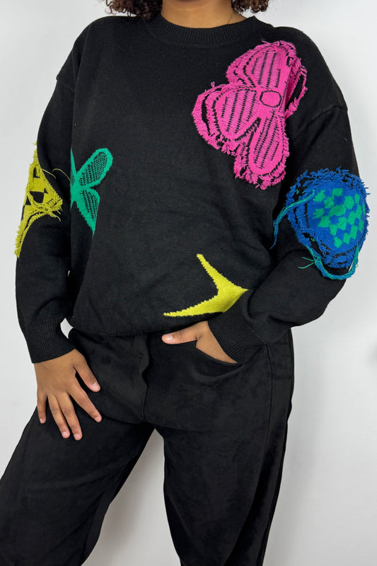 Strickpullover mit bunten Blumen-Details –Schwarz