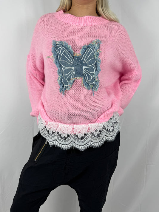 Strick Shirt mit Schmetterlings-Applikation & Spitzenabschluss-Rosa