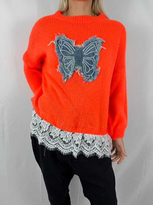 Strick Shirt mit Schmetterlings-Applikation & Spitzenabschluss-Orange