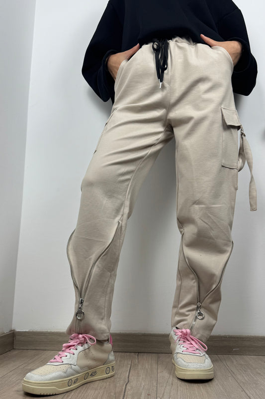 Damen Cargo Jogginghose mit Reißverschluss-Details und elastischem Bund –Beige
