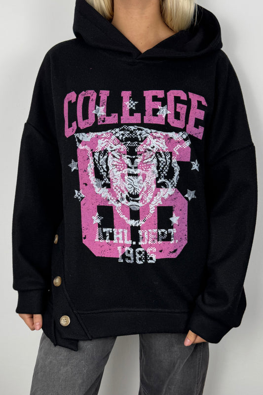 College Hoodie mit Tigerprint und Knopfdetails-Schwarz