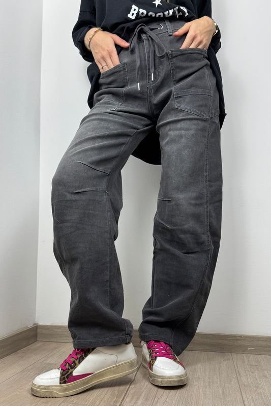 Trendige Damen-Jeans in Grau mit Kontrastnähten und Kordel