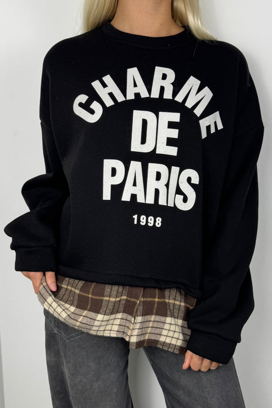 Sweatshirt mit „Charme de Paris“ Print und Karodetail-Schwarz