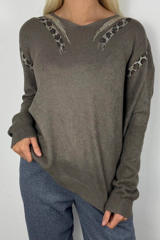 Feinstrick Pullover mit Glitzer-Details und V-Ausschnitt-Mud