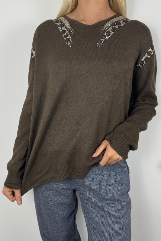 Feinstrick Pullover mit Glitzer-Details und V-Ausschnitt-Choco