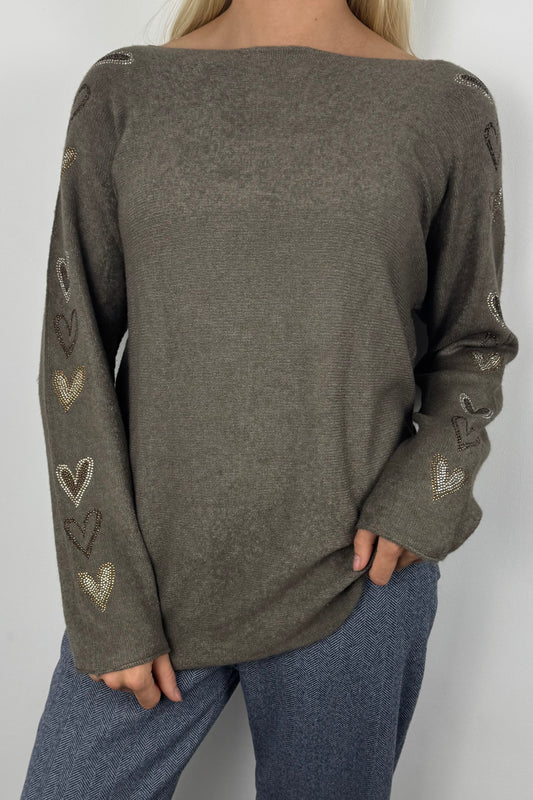 Feinstrick Pullover mit Glitzer-Herz-Details-Mud