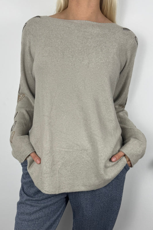 Feinstrick Pullover mit Glitzer-Herz-Details-Beige