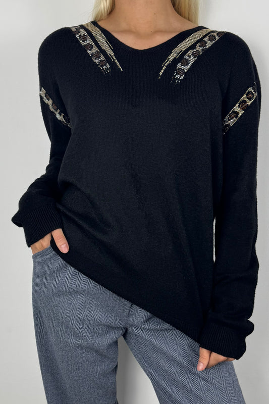 Feinstrick Pullover mit Glitzer-Details und V-Ausschnitt-Schwarz