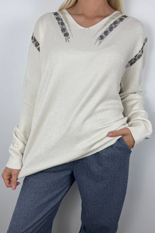 Feinstrick Pullover mit Glitzer-Details und V-Ausschnitt-Weiß