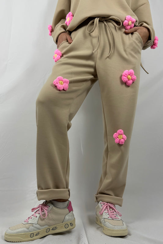 Hose mit Häkelblumen & Kordelzug-Beige