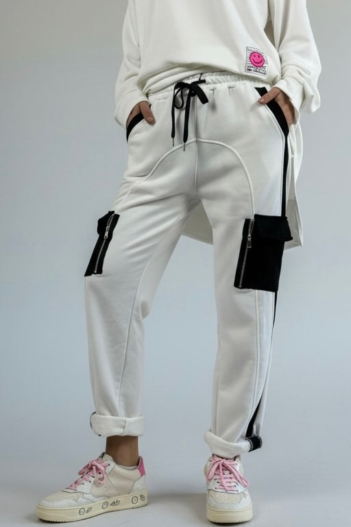 Hose mit Kontrastdetails & Reißverschlusstaschen -Weiß
