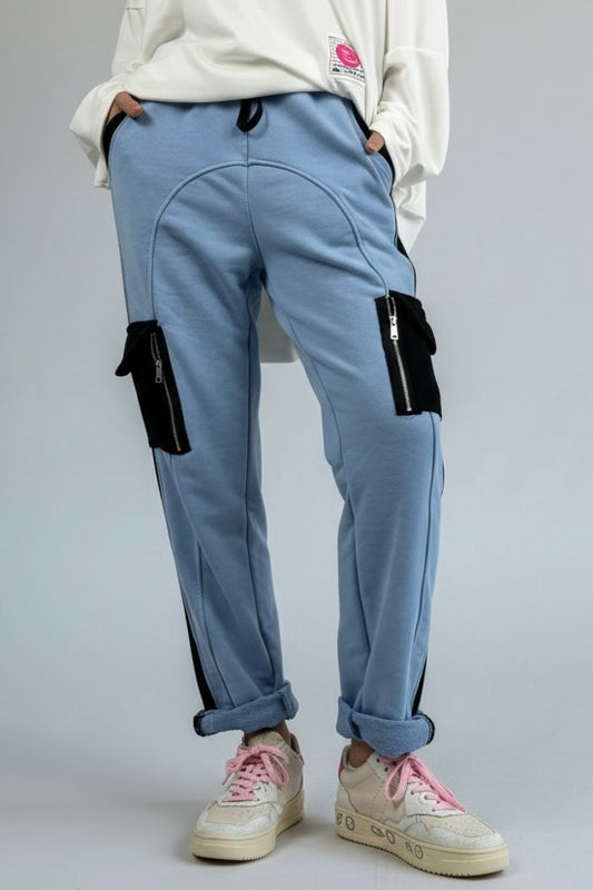 Hose mit Kontrastdetails & Reißverschlusstaschen-Hellblau