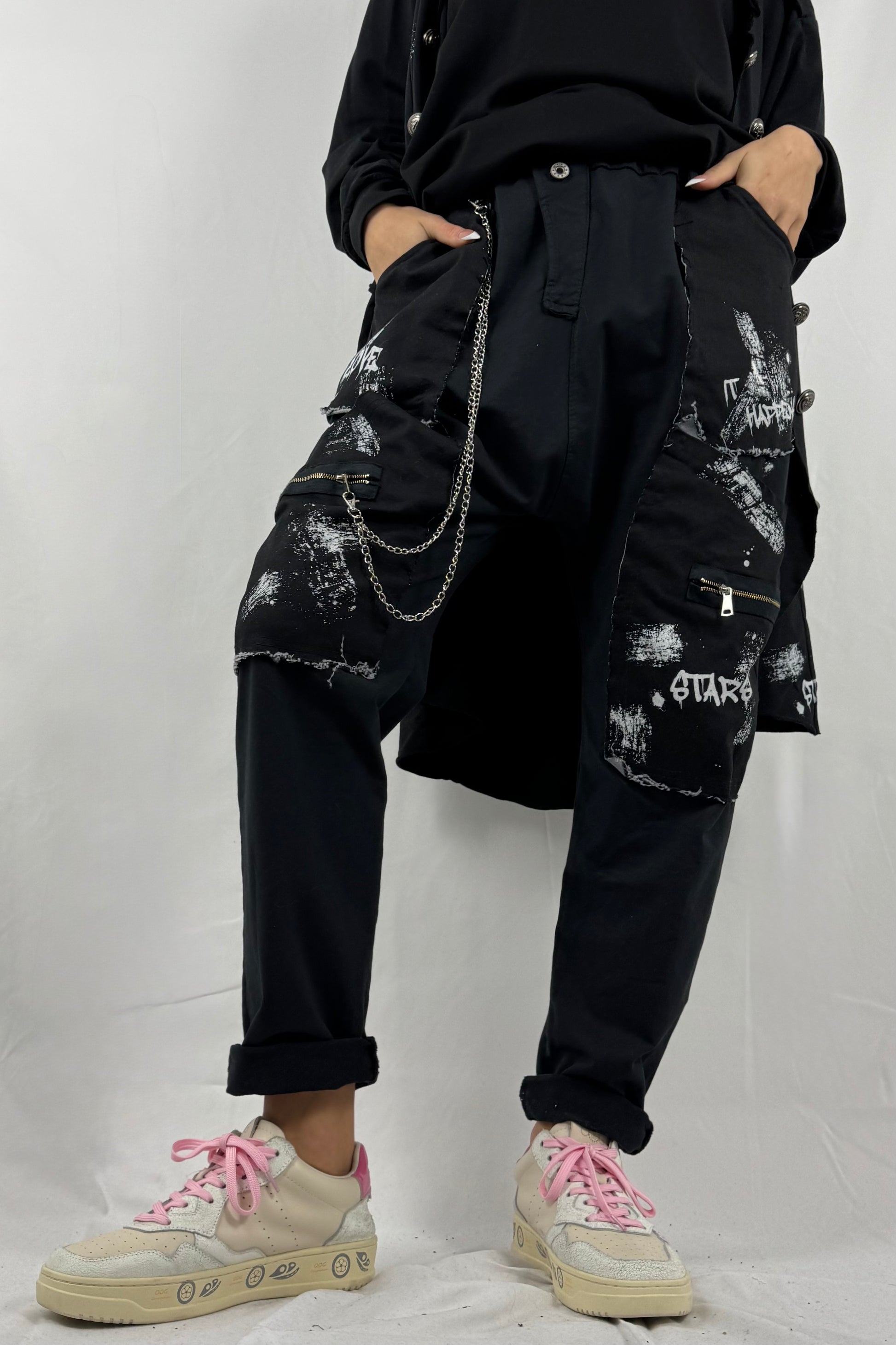 Baggy Hose mit Print, Kette & Zipper-Taschen –Schwarz