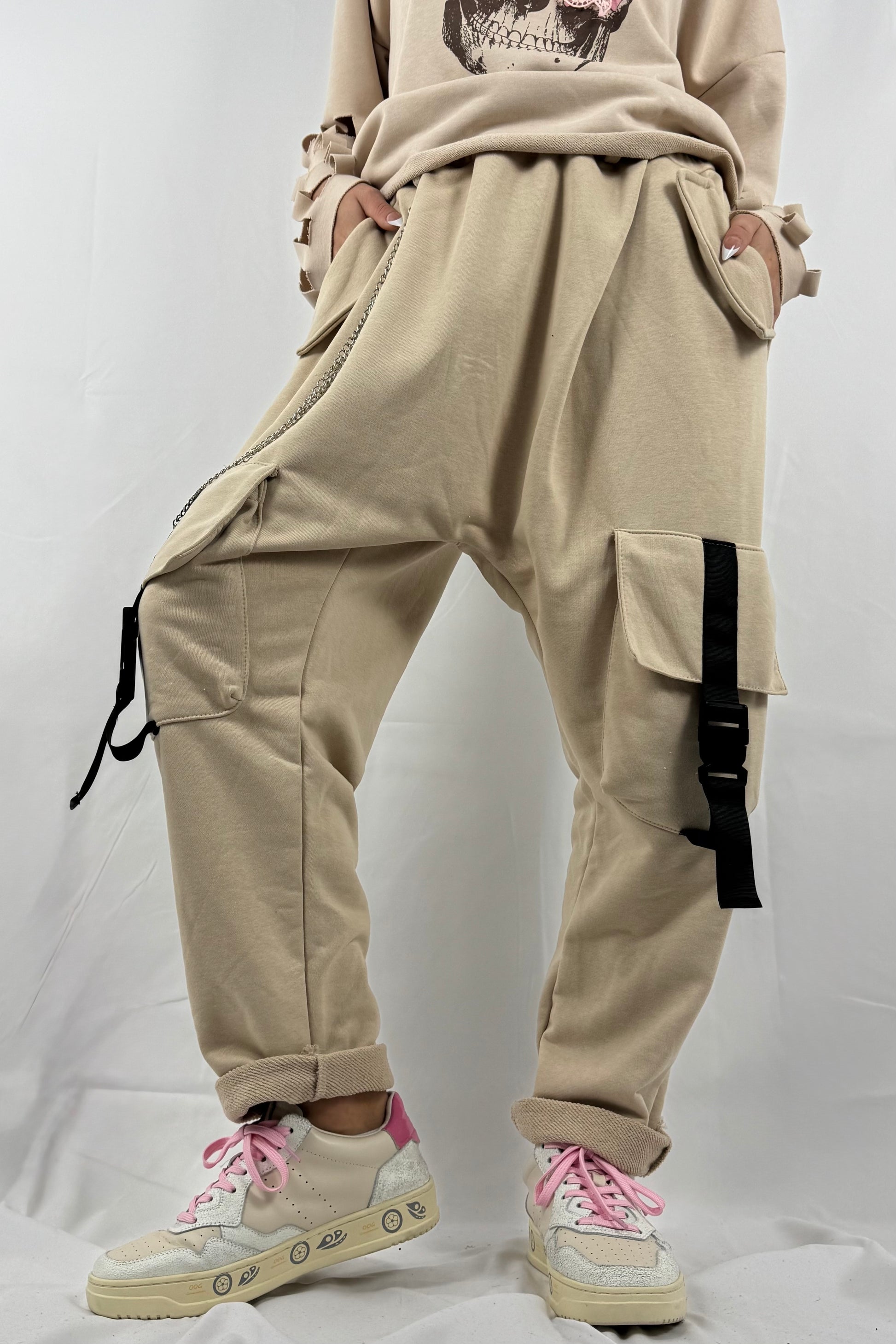 Cargo Jogpants mit Kette & Taschen –Beige