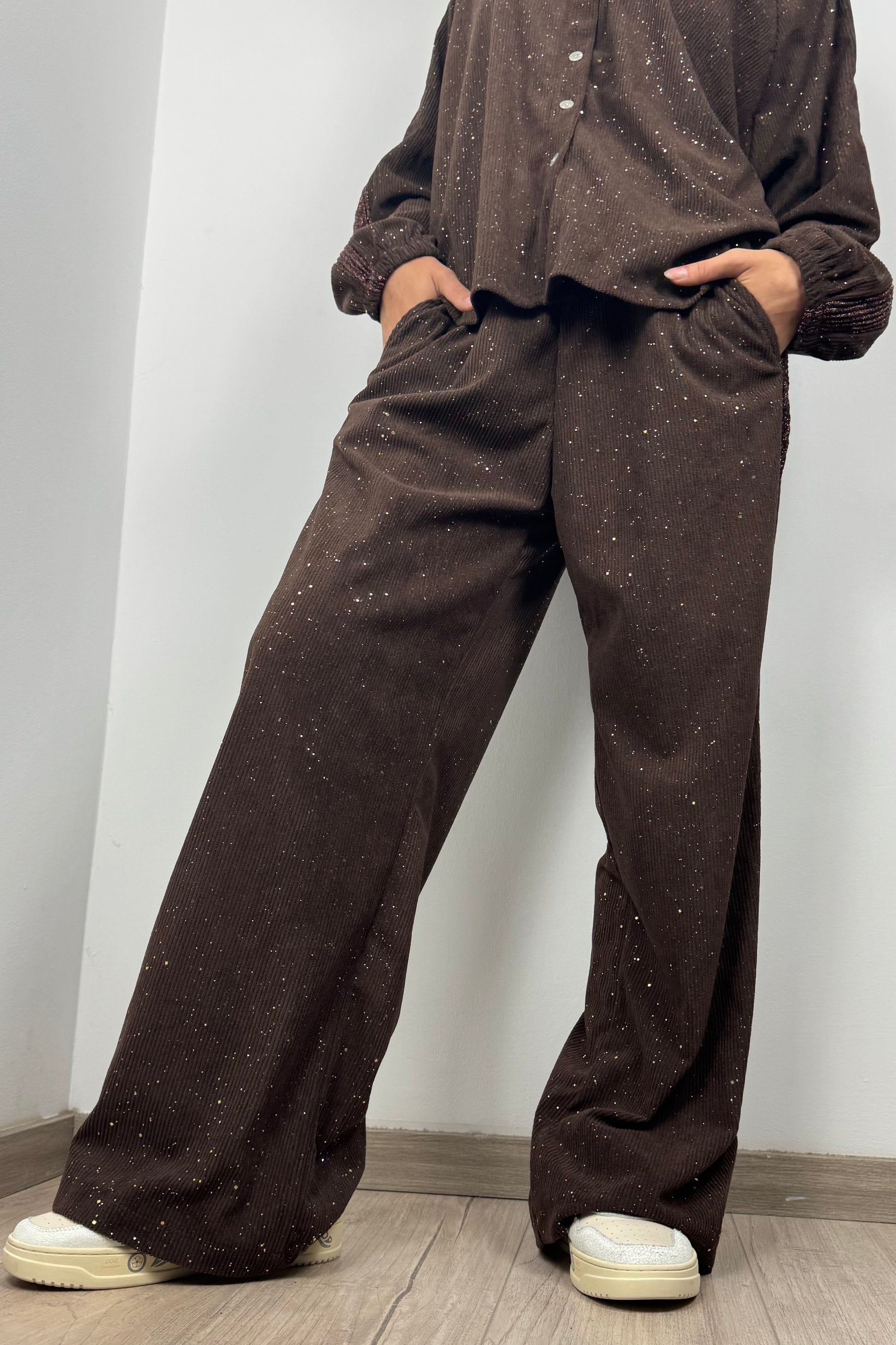 Bequeme und stylische Cordhose mit funkelnden Glitzerelementen an den Seiten. Der elastische Bund sorgt für eine optimale Passform, während der weiche Stoff hohen Tragekomfort bietet. Perfekt kombinierbar mit Blusen, Shirts oder Pullovern – lässig und zugleich elegant.