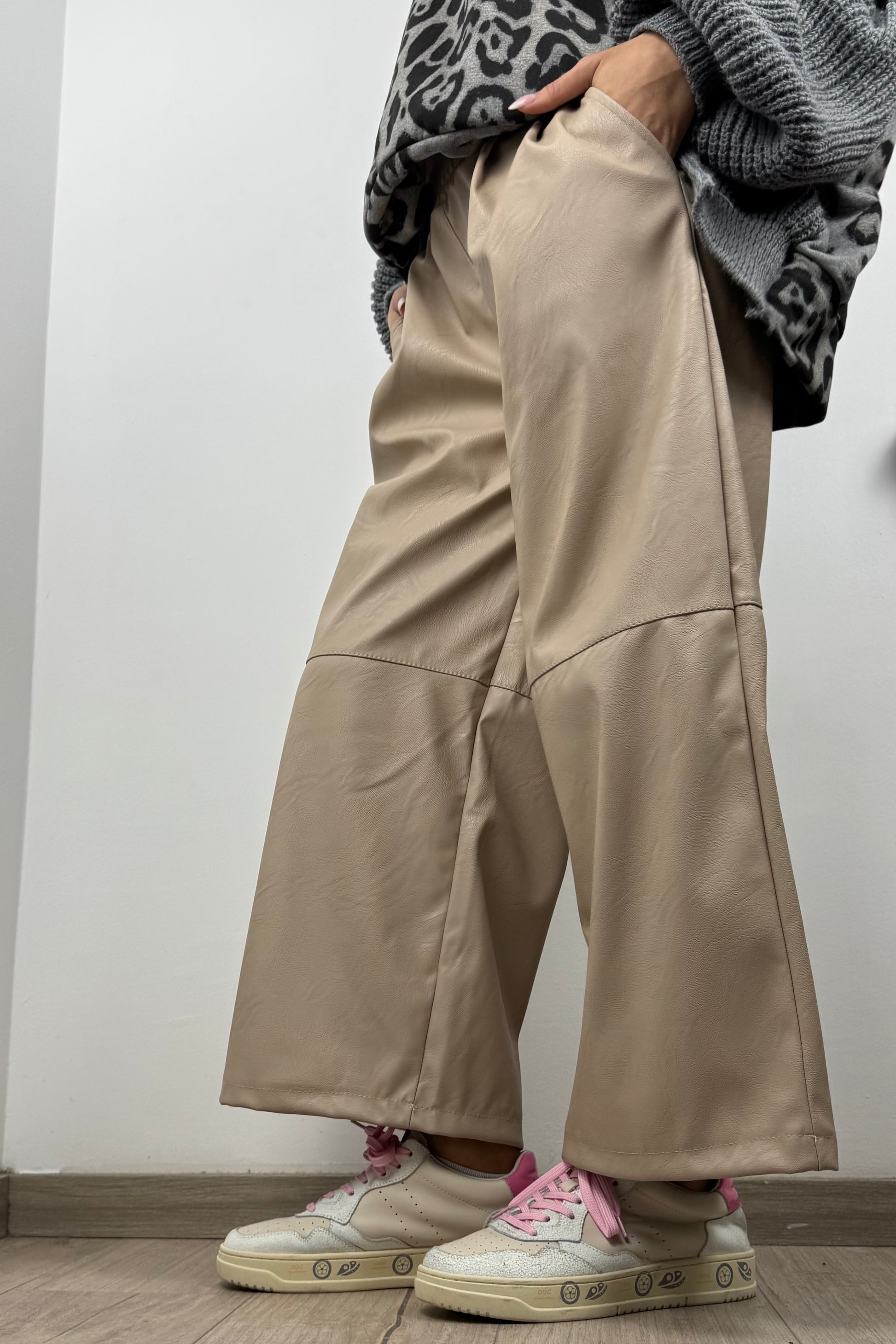 Cropped Leder-Look Hose mit Gummibund –Beige