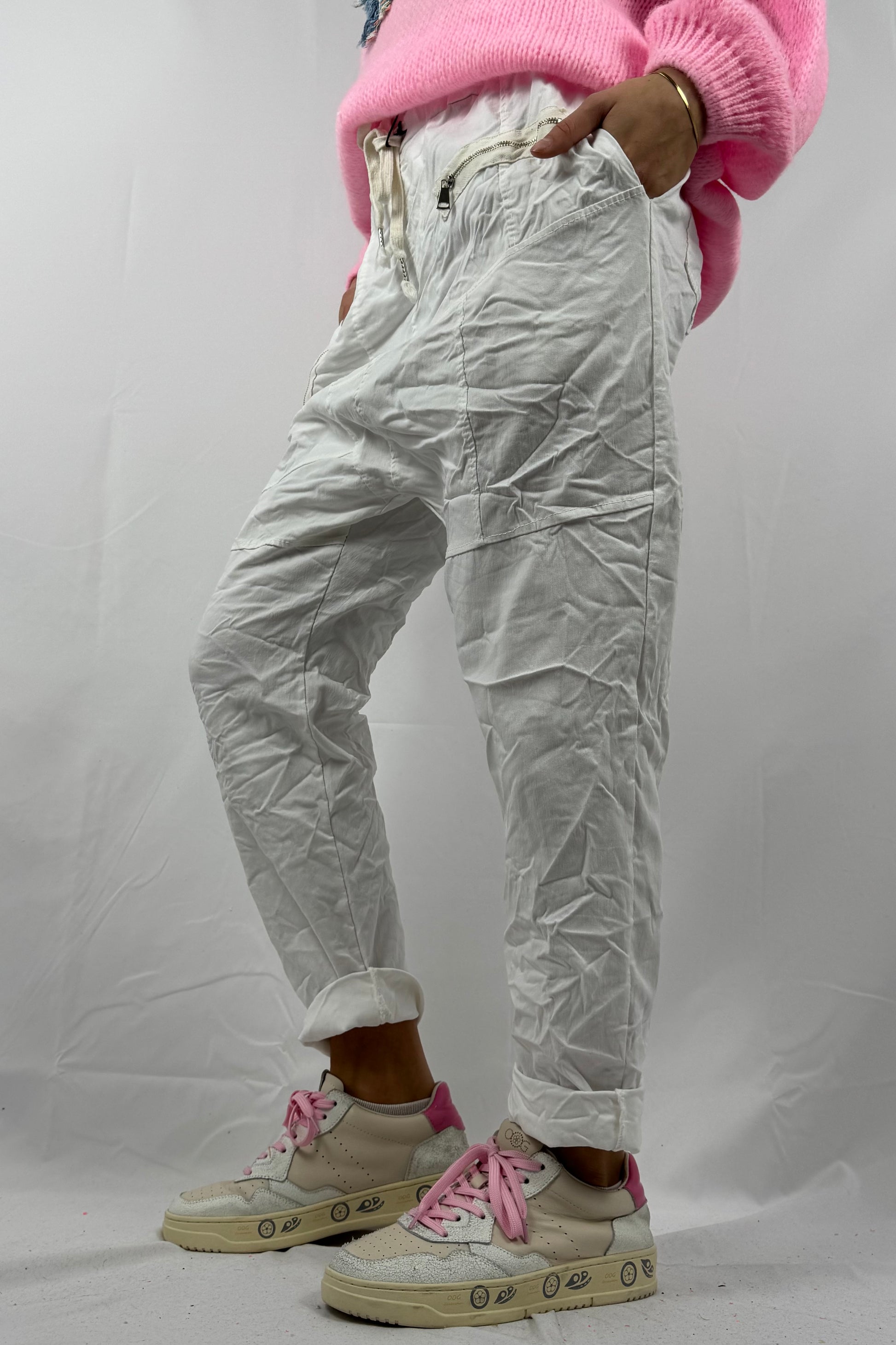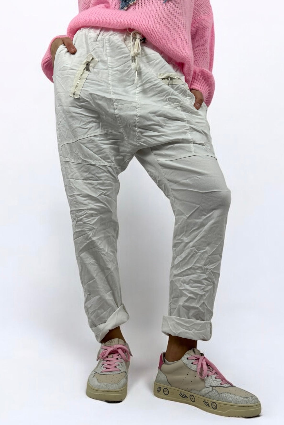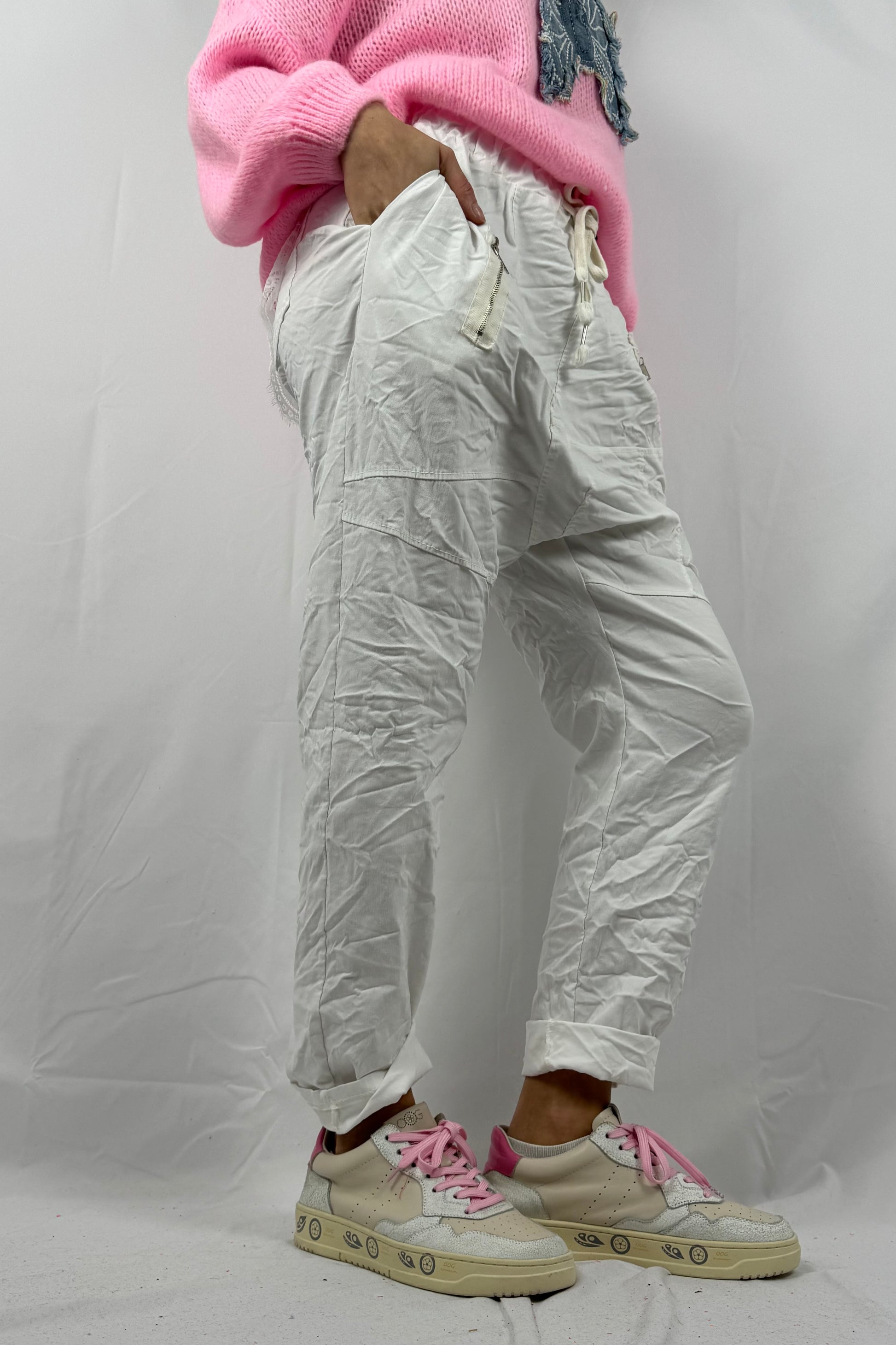 Hose mit elastischem Bund & Reißverschlusstaschen-Weiß