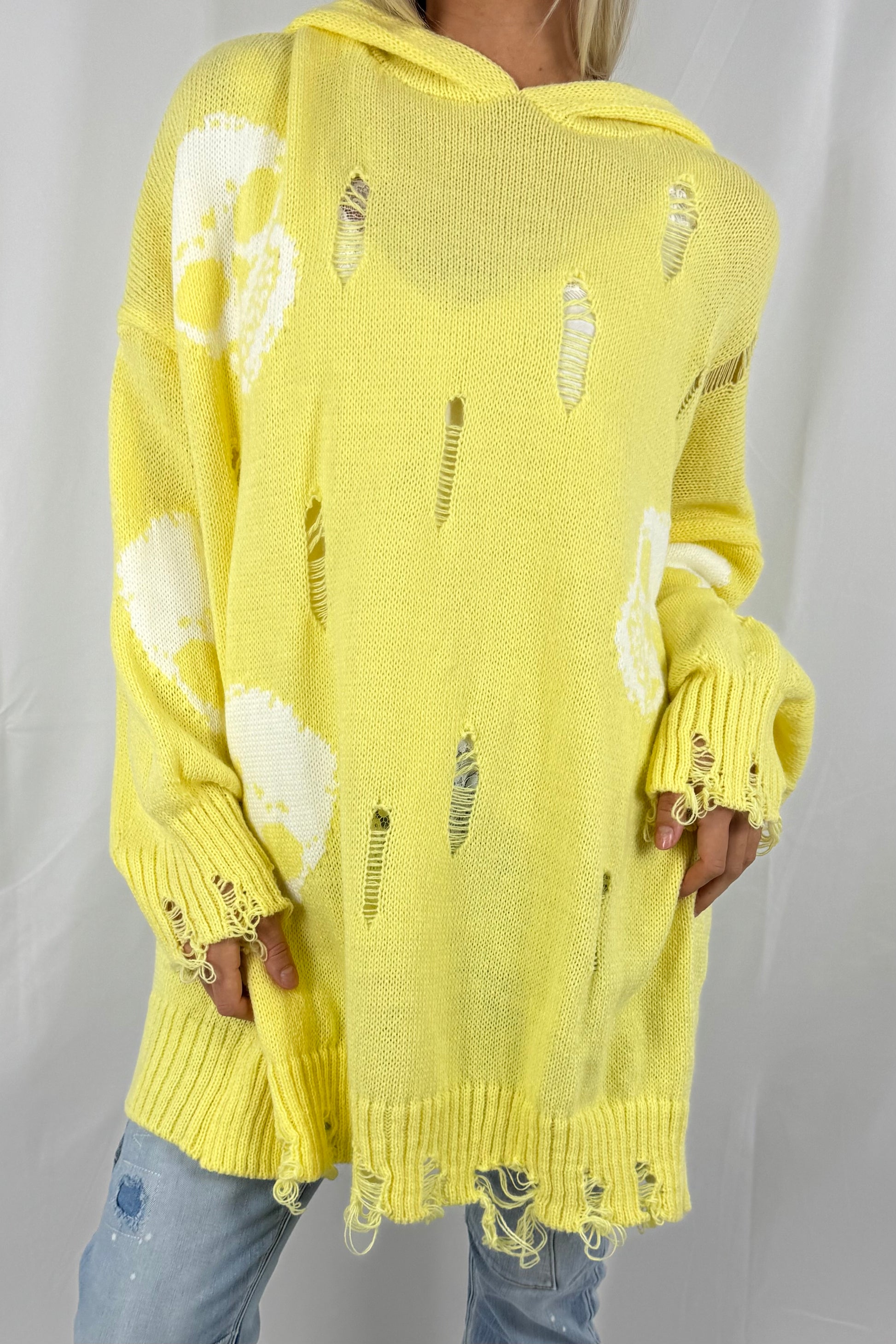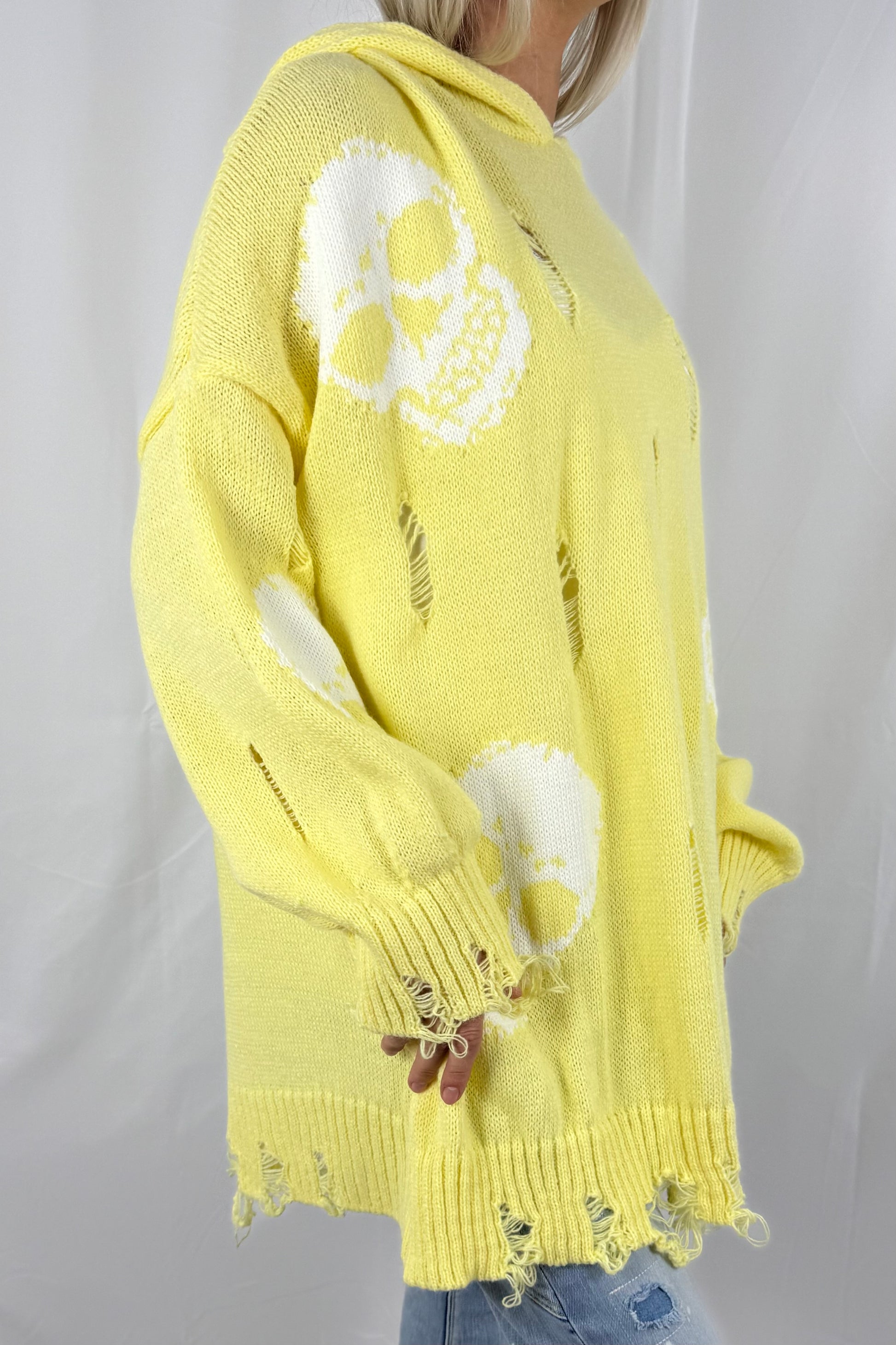 Dieser Strickpullover hat einen auffälligen Totenkopf-Print (Skull-Motiv) und einen angesagten Used-Look mit dekorativen Rissen. Die lockere Passform und die Kapuze sorgen für einen lässigen, modernen Stil und hohen Tragekomfort. Ideal für Alltag und Freizeit.