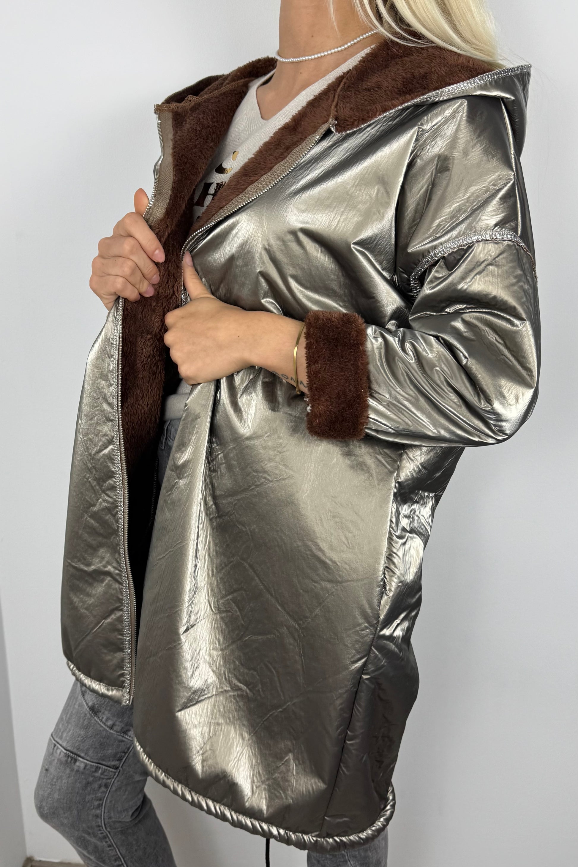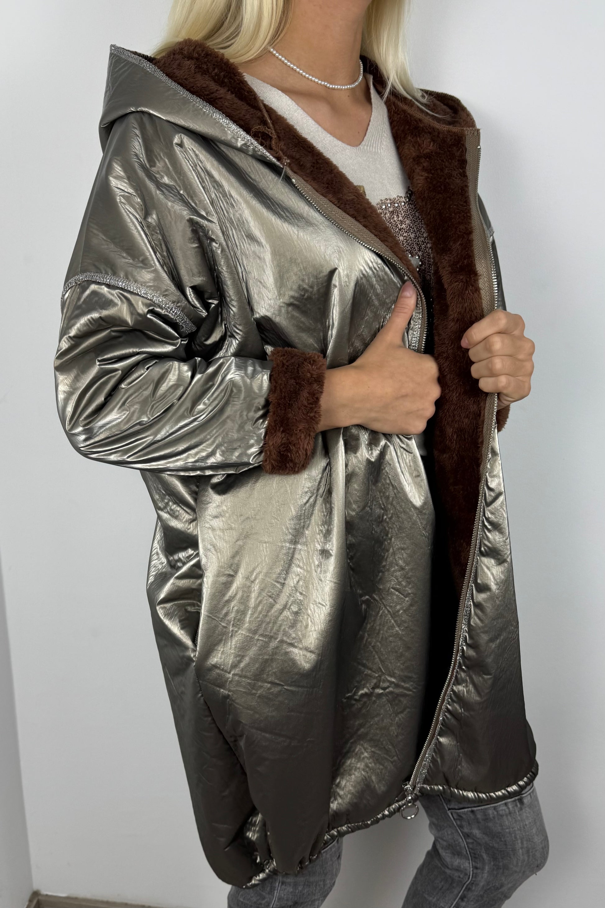 Trendige Damenjacke mit glänzender Metallic-Oberfläche und kuscheligem Innenfutter.