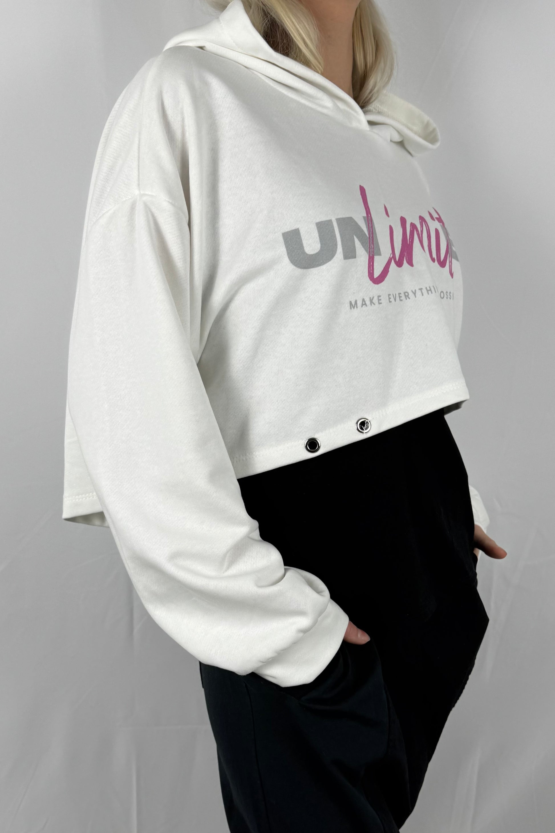 Cropped Hoodie „Unlimited – Make Everything Possible“-Weiß
