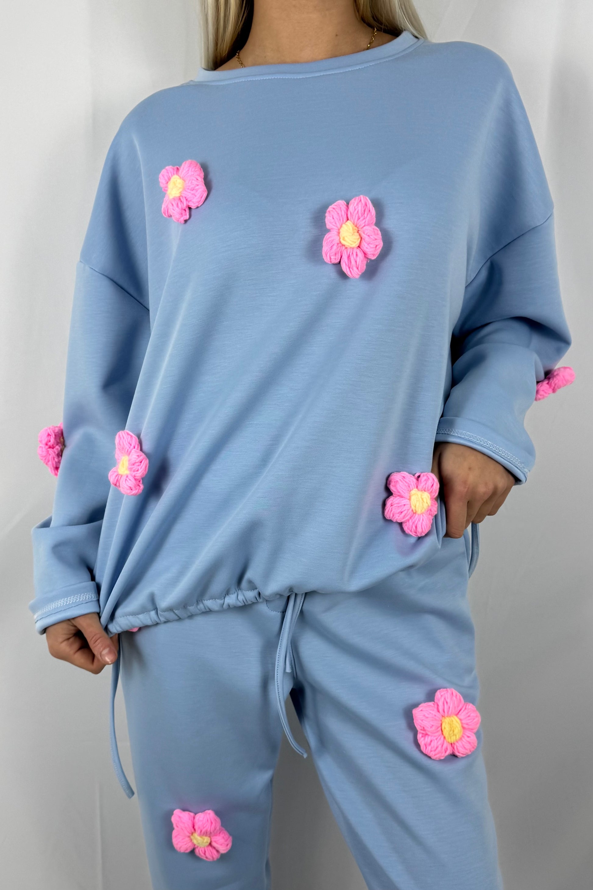 Shirt mit Häkelblumen & Tunnelzug-Hell Blau