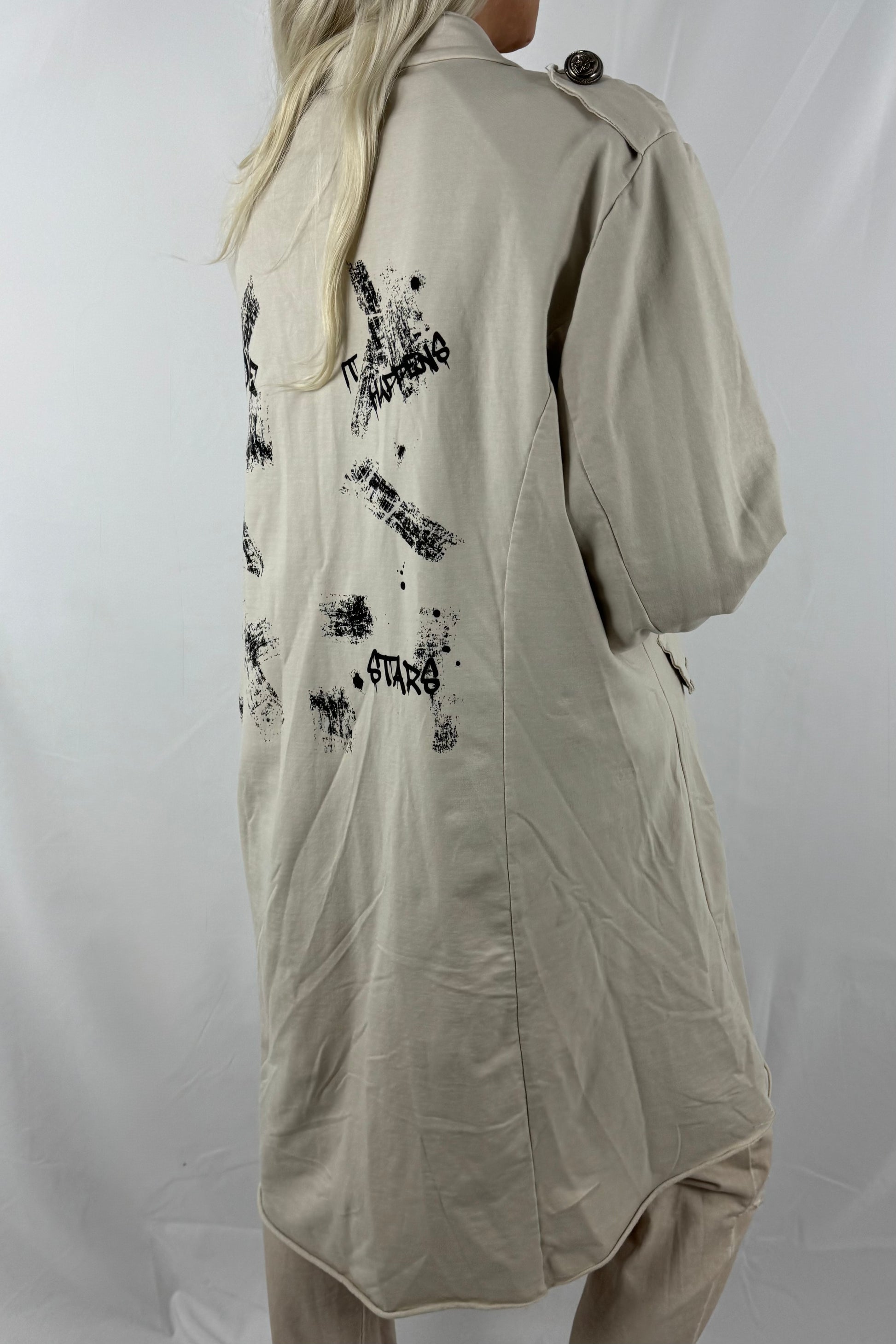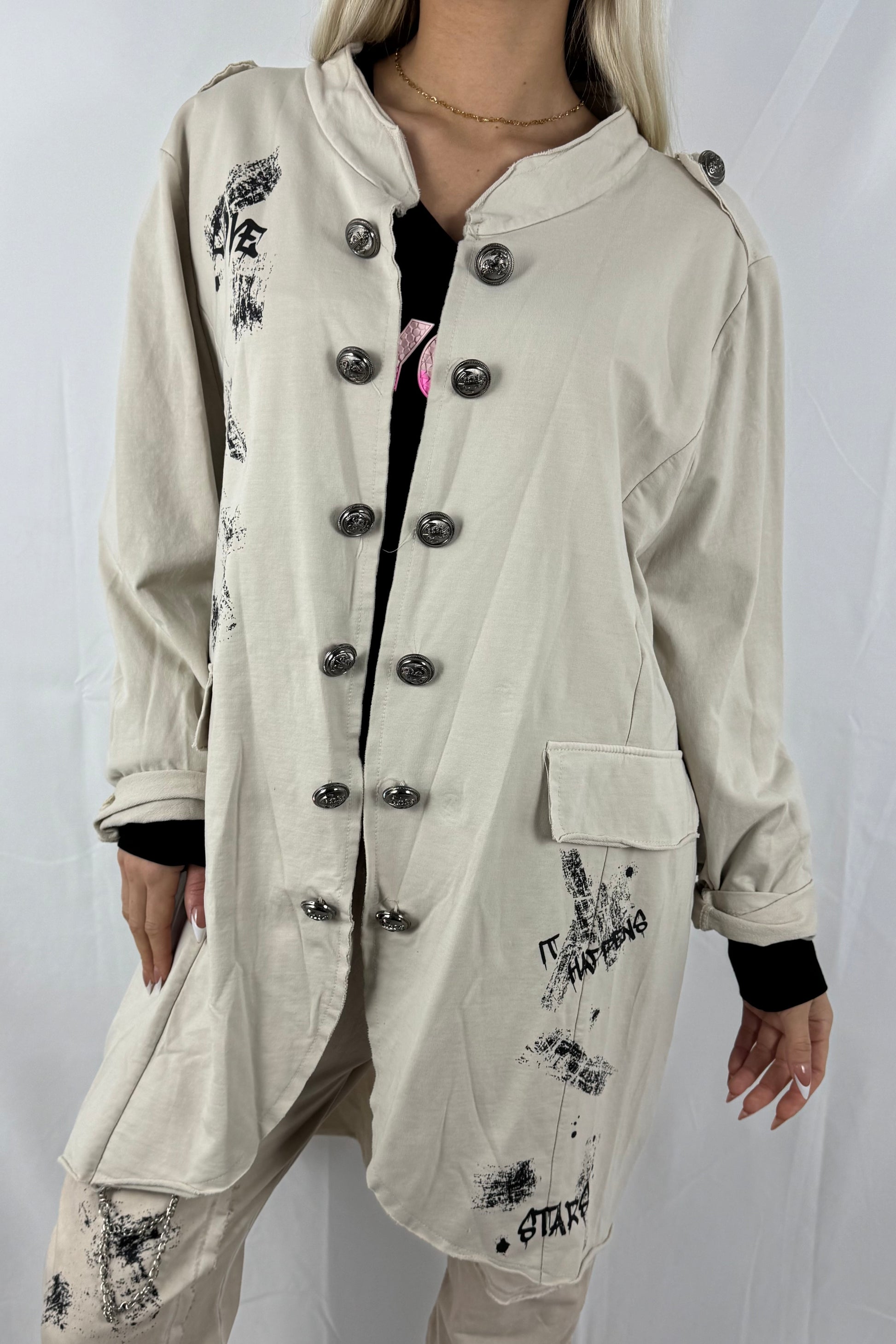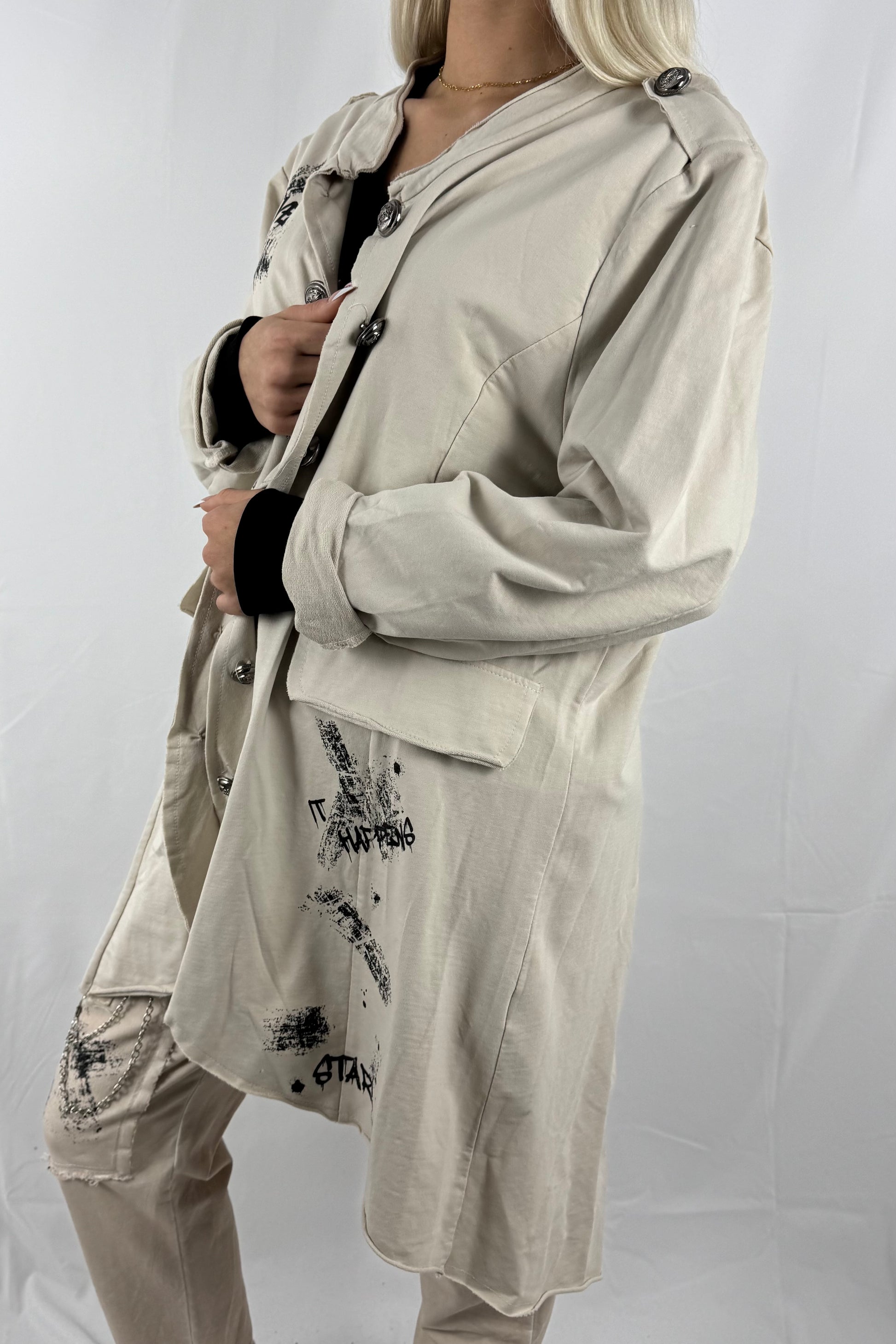 Moderner Mantel mit lockerem Schnitt und angenehmem Tragekomfort. Das Design wird durch markante Prints mit den Schriftzügen „LOVE“ und „STAR“ ergänzt. Die durchgehende Knopfleiste, aufgesetzte Taschen und die leicht verlängerte Form sorgen für einen stylischen Look.Der Mantel ist elastisch und passt sich flexibel an verschiedene Körperformen an.