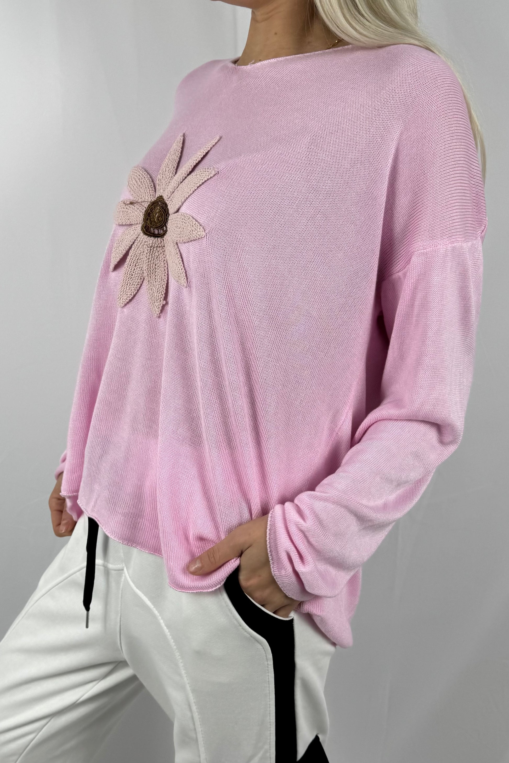 Shirt mit V-Ausschnitt & floraler Applikation-Rosa