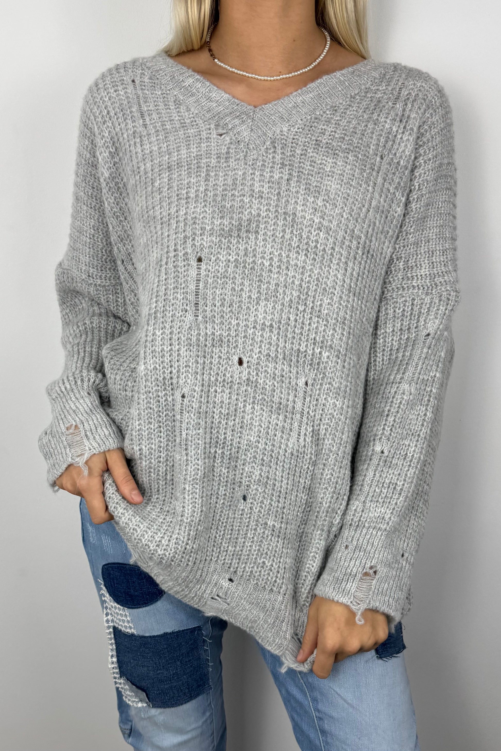 Weicher Oversize Strickpullover mit modernem V-Ausschnitt und trendigen Used-Details. Der lockere Schnitt sorgt für hohen Tragekomfort und macht den Pullover ideal für Alltag und Freizeit. Perfekt kombinierbar zu Jeans, Leggings oder Röcken.