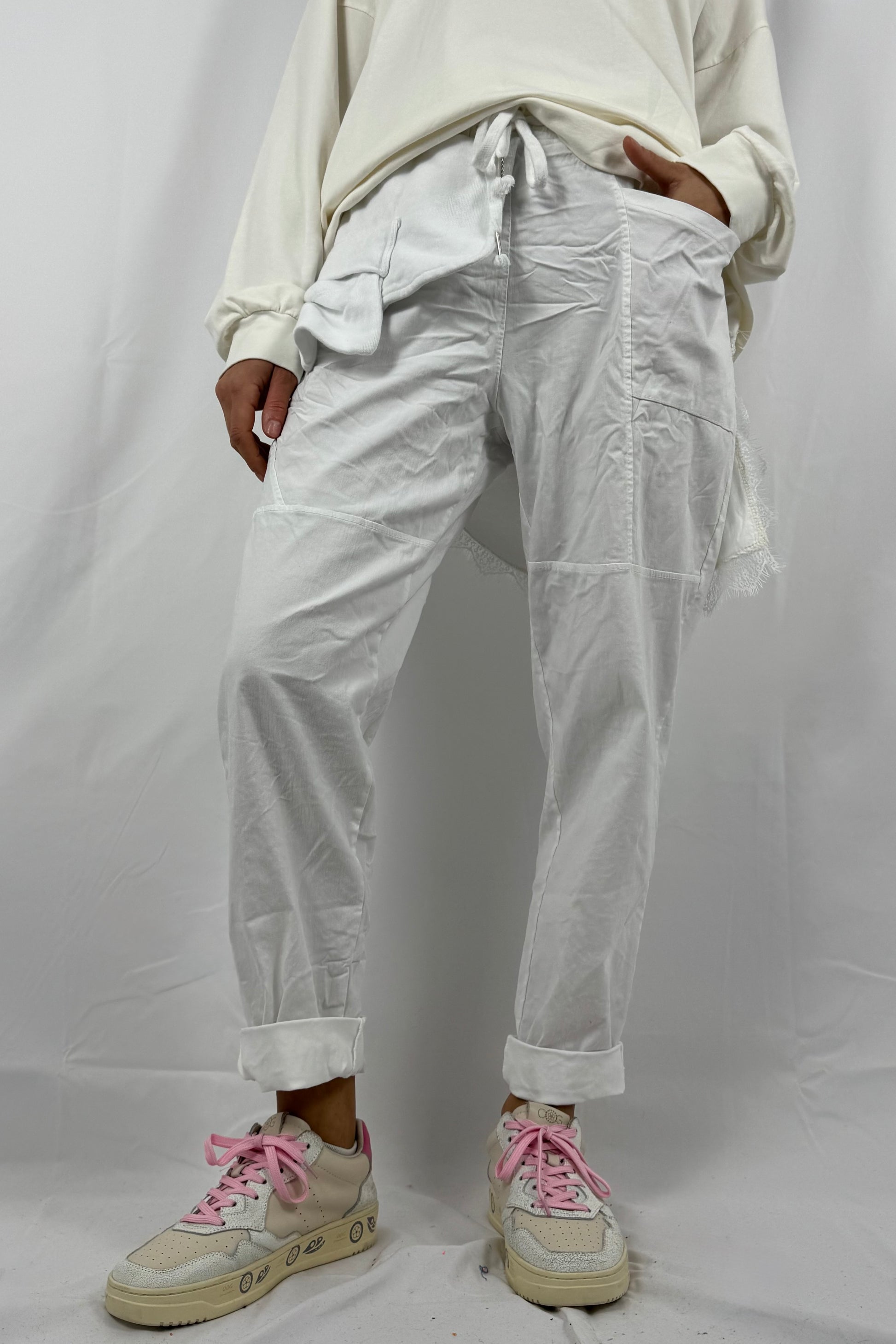 Damen Hose mit Elastikbund & Taschen-Detail-Weiß
