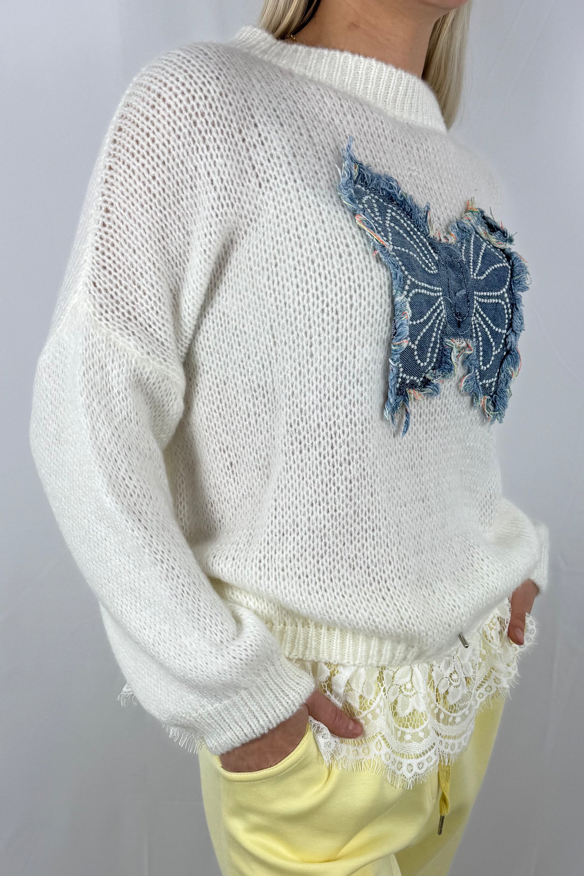 Locker geschnittenes Strick Shirt mit auffälliger Schmetterlings-Applikation auf der Vorderseite. Der feine Strick wird am Saum durch einen Spitzenabschluss ergänzt und verleiht dem Modell einen besonderen Layer-Look. Bequem, weich und ideal für Alltag und Freizeit.