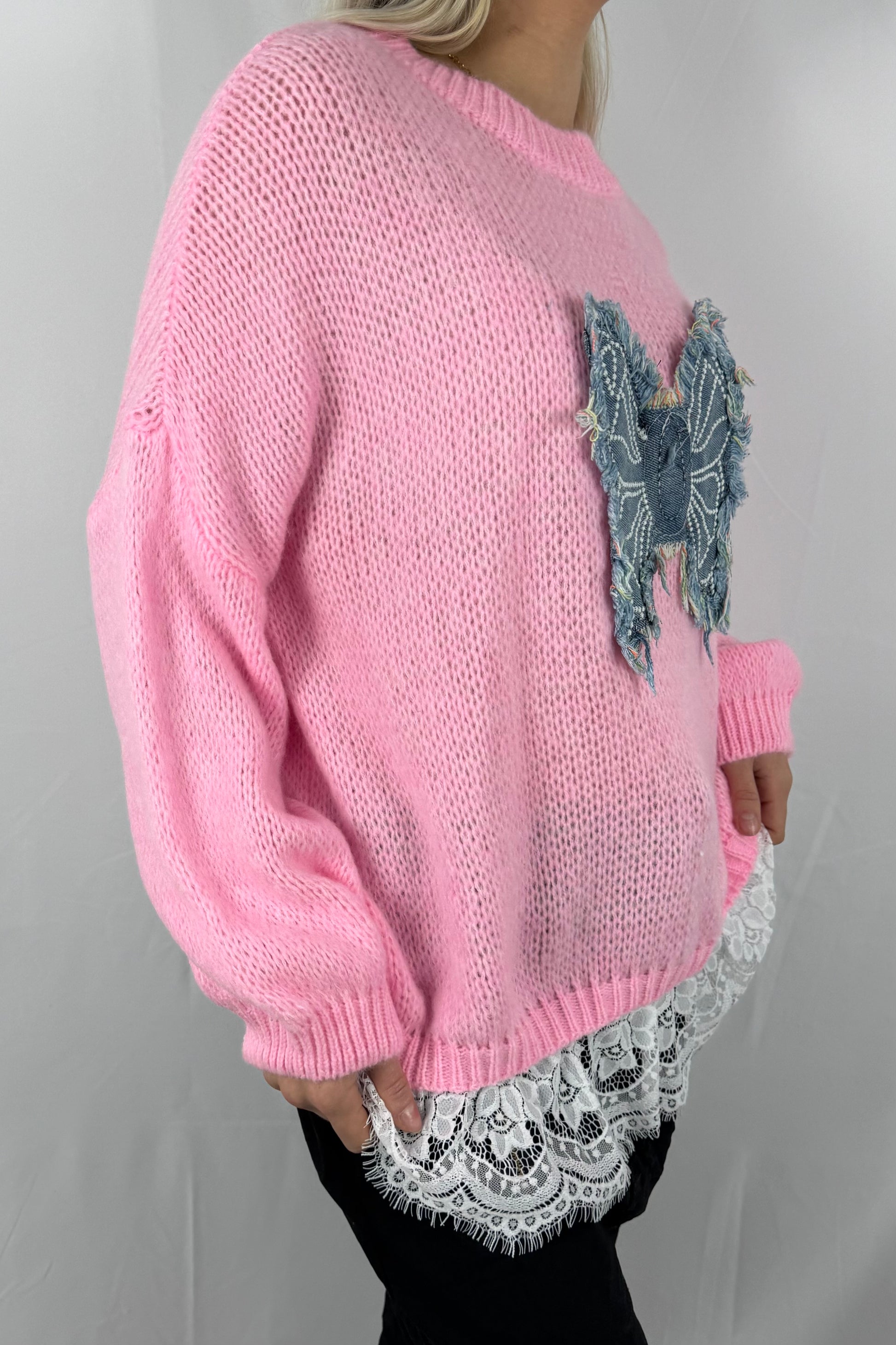 Strick Shirt mit Schmetterlings-Applikation & Spitzenabschluss-Rosa