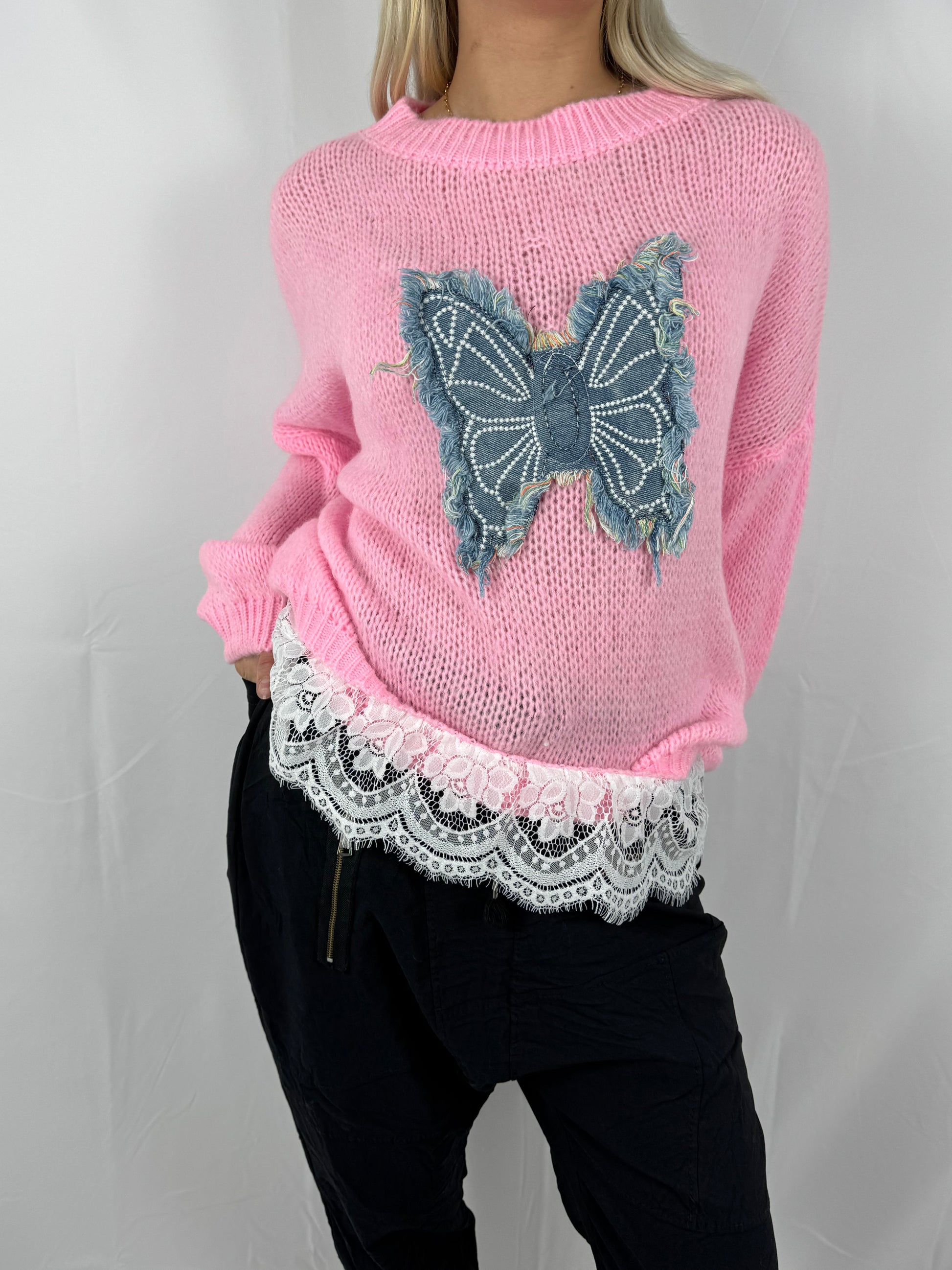 Locker geschnittenes Strick Shirt mit auffälliger Schmetterlings-Applikation auf der Vorderseite. Der feine Strick wird am Saum durch einen Spitzenabschluss ergänzt und verleiht dem Modell einen besonderen Layer-Look. Bequem, weich und ideal für Alltag und Freizeit.