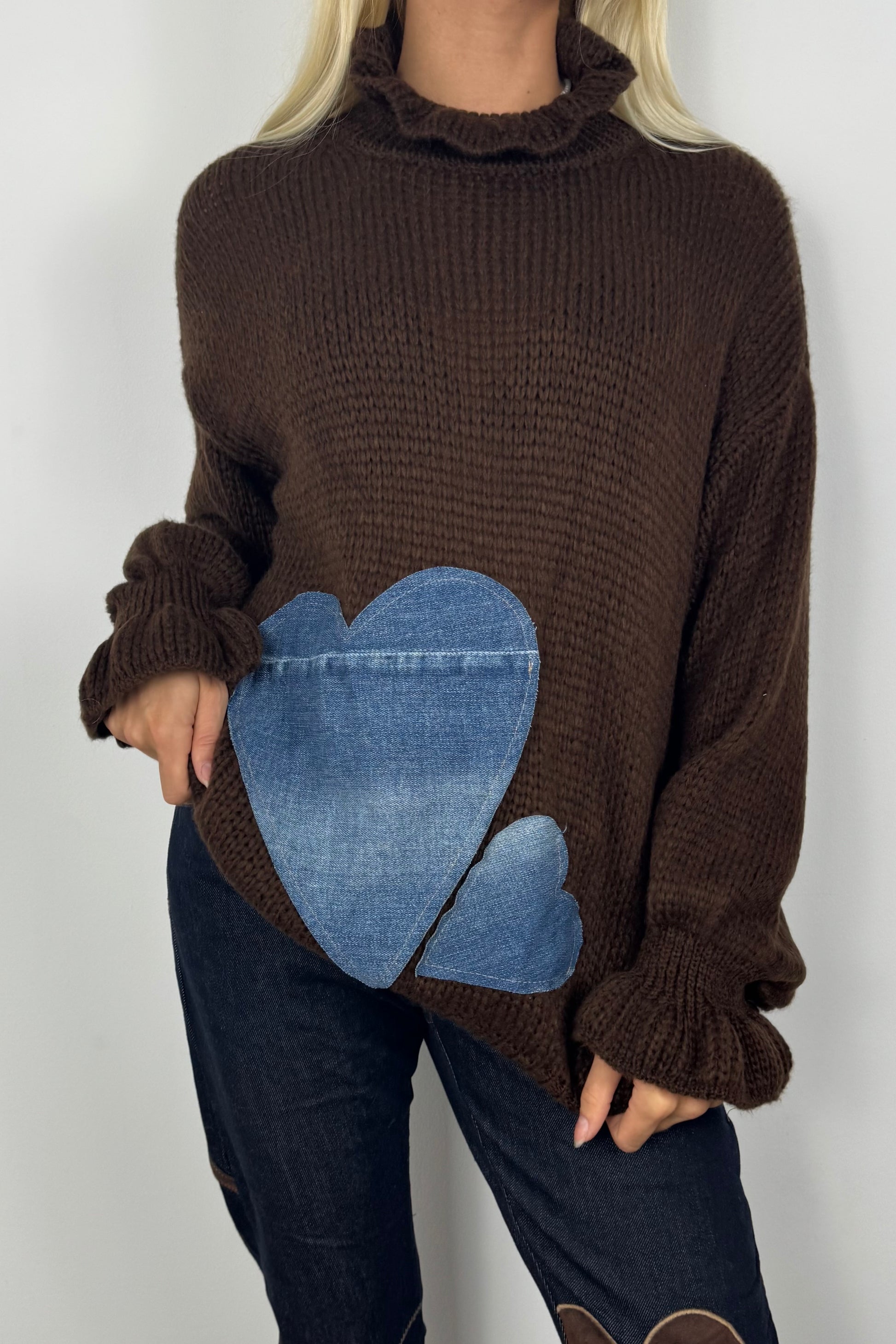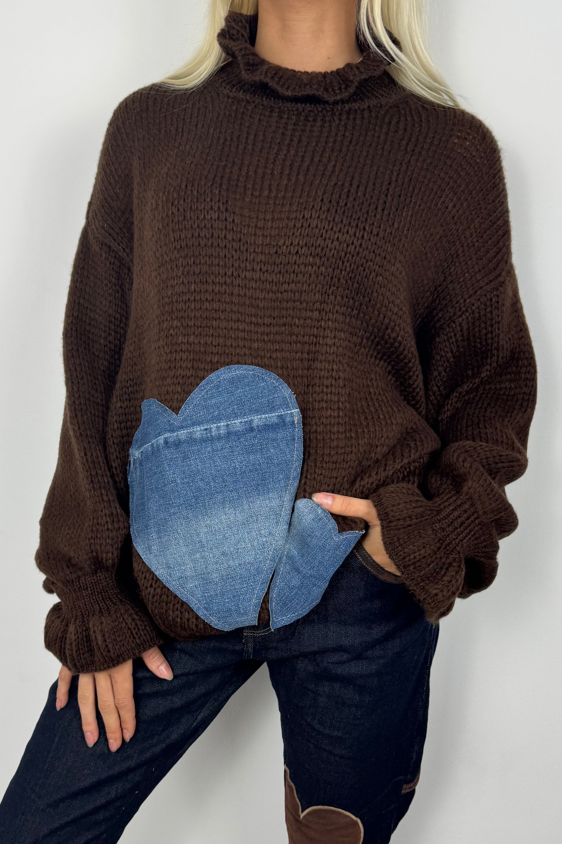 Kuscheliger Strickpullover mit modernem Herz-Design aus Jeansstoff. Der hohe Kragen und die lockere Passform machen ihn zum idealen Begleiter für kühle Tage. Perfekt kombinierbar zu Jeans, Hosen oder Röcken – stylisch und bequem zugleich.