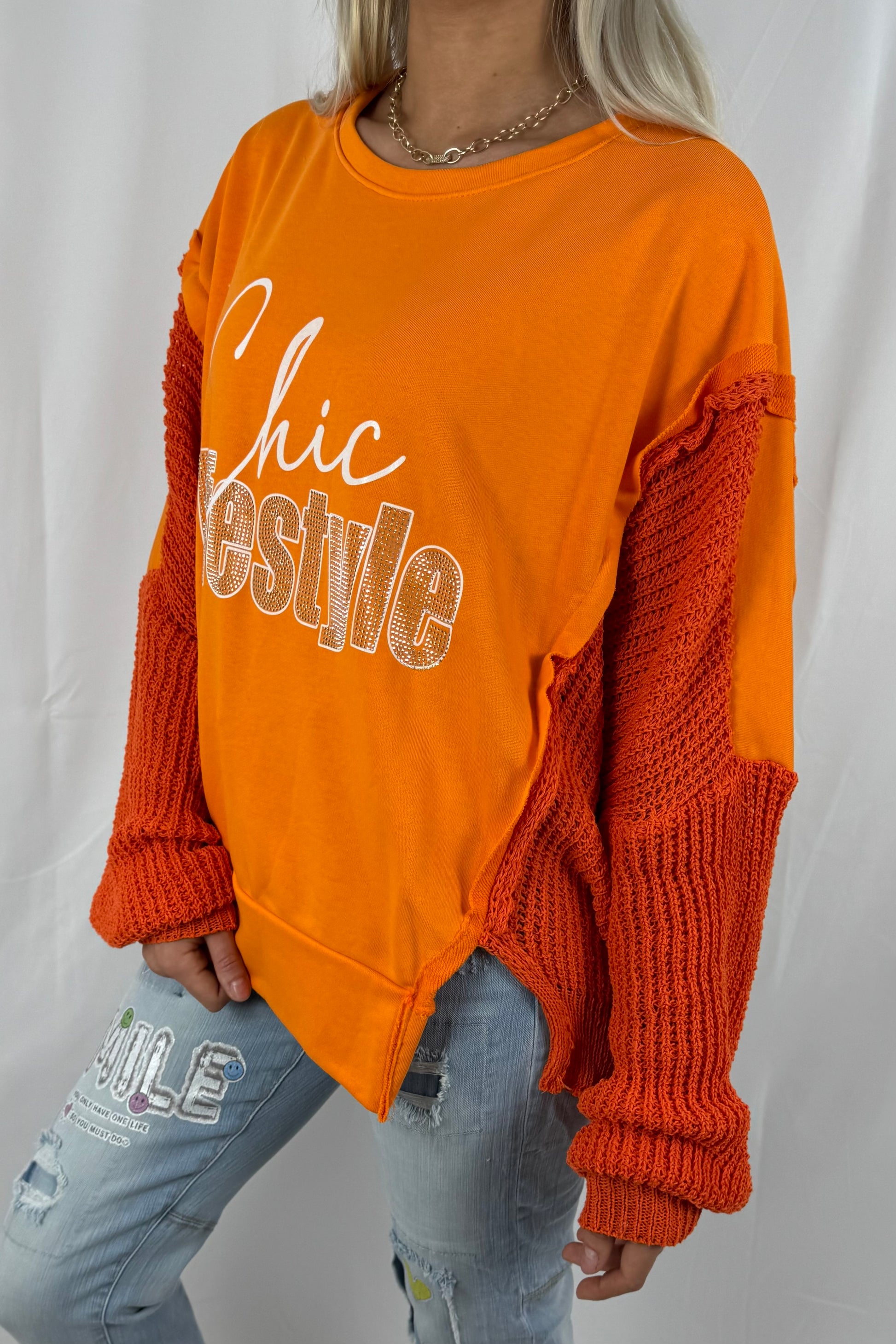 Sweatshirt mit Schrift-Print & Strickärmeln-Orange